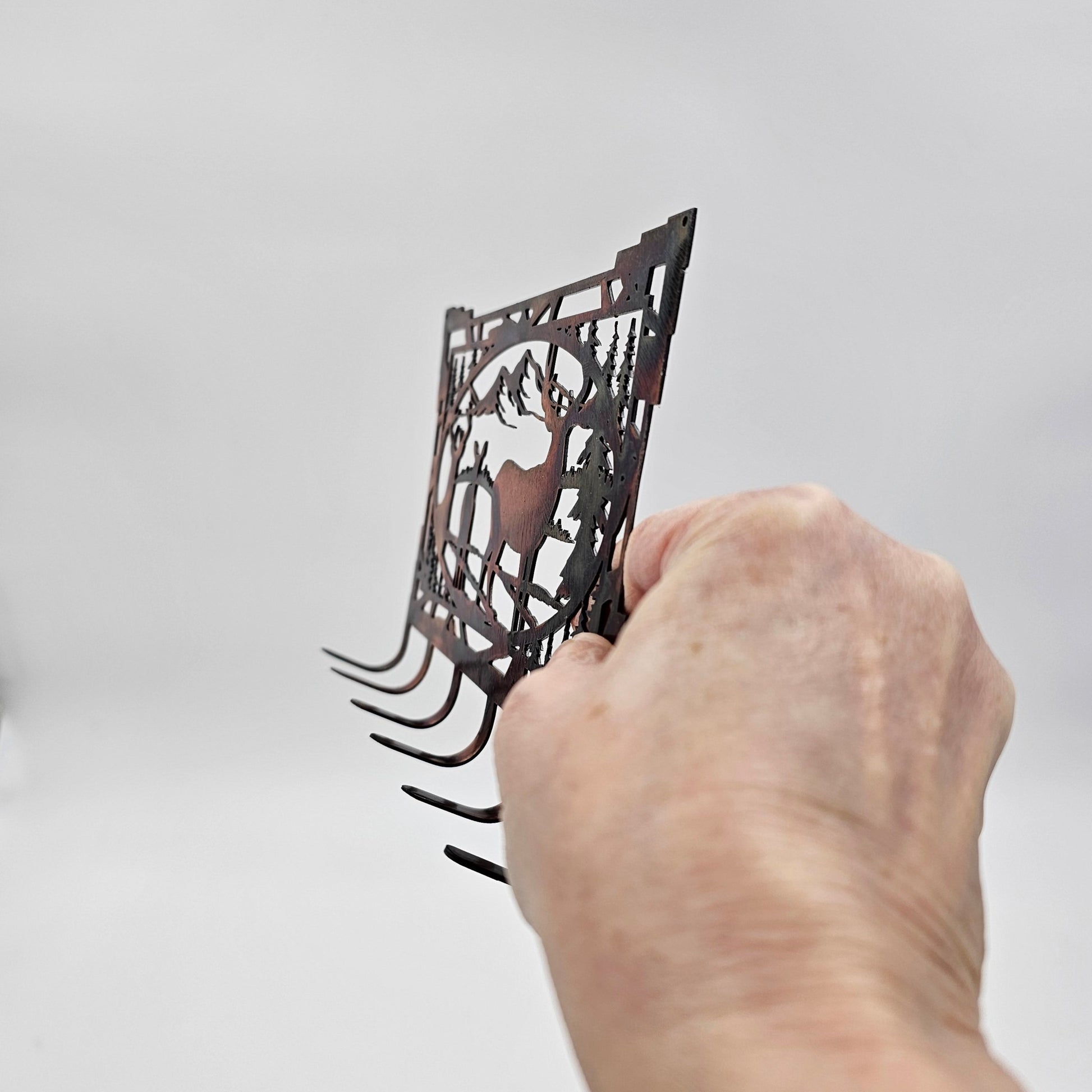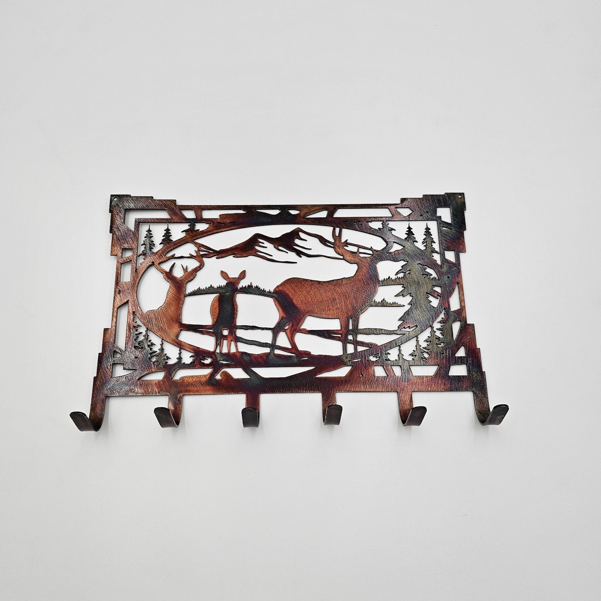 This Rustic Metal Deer Key Rack is 8" wide x 5.5" high x 18-gauge thick. Six hooks allow for easy storage of keys, while two holes in the top corners enable easy hanging with two nails (not included). Available in five colors - Colored, Flat Black, Gloss Black, Hammer Tone, and Bare Metal. The colored version is hand ground after cutting to give it a textured appearance which may result in slight scratch marks on the finished product. Coloring may vary with the colored version due to the coloring process, but we do our best to replicate what you see in the photos. The black, hammer tone and bare metal versions will have a smooth finish. Each piece is coated with a thick layer of Varathane.