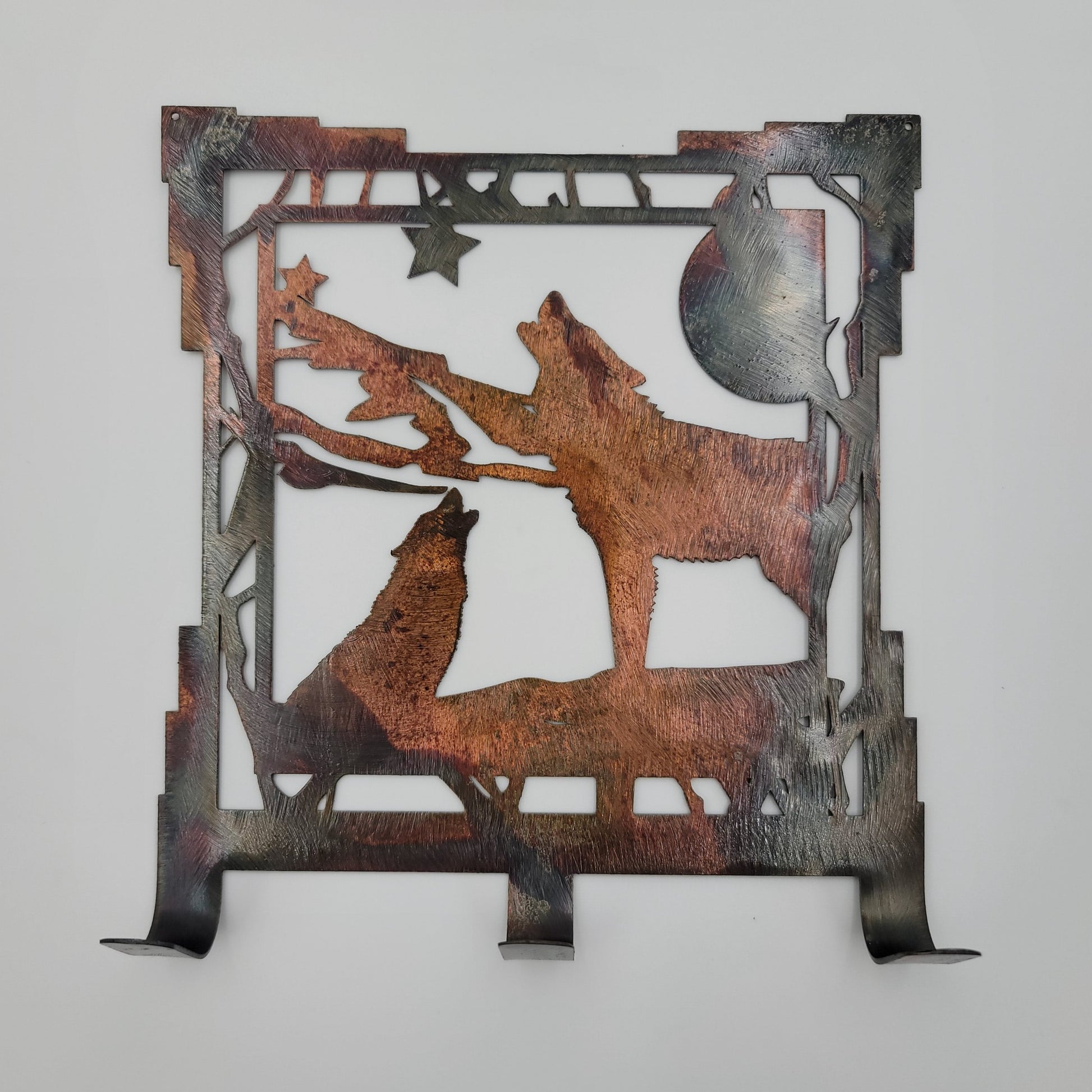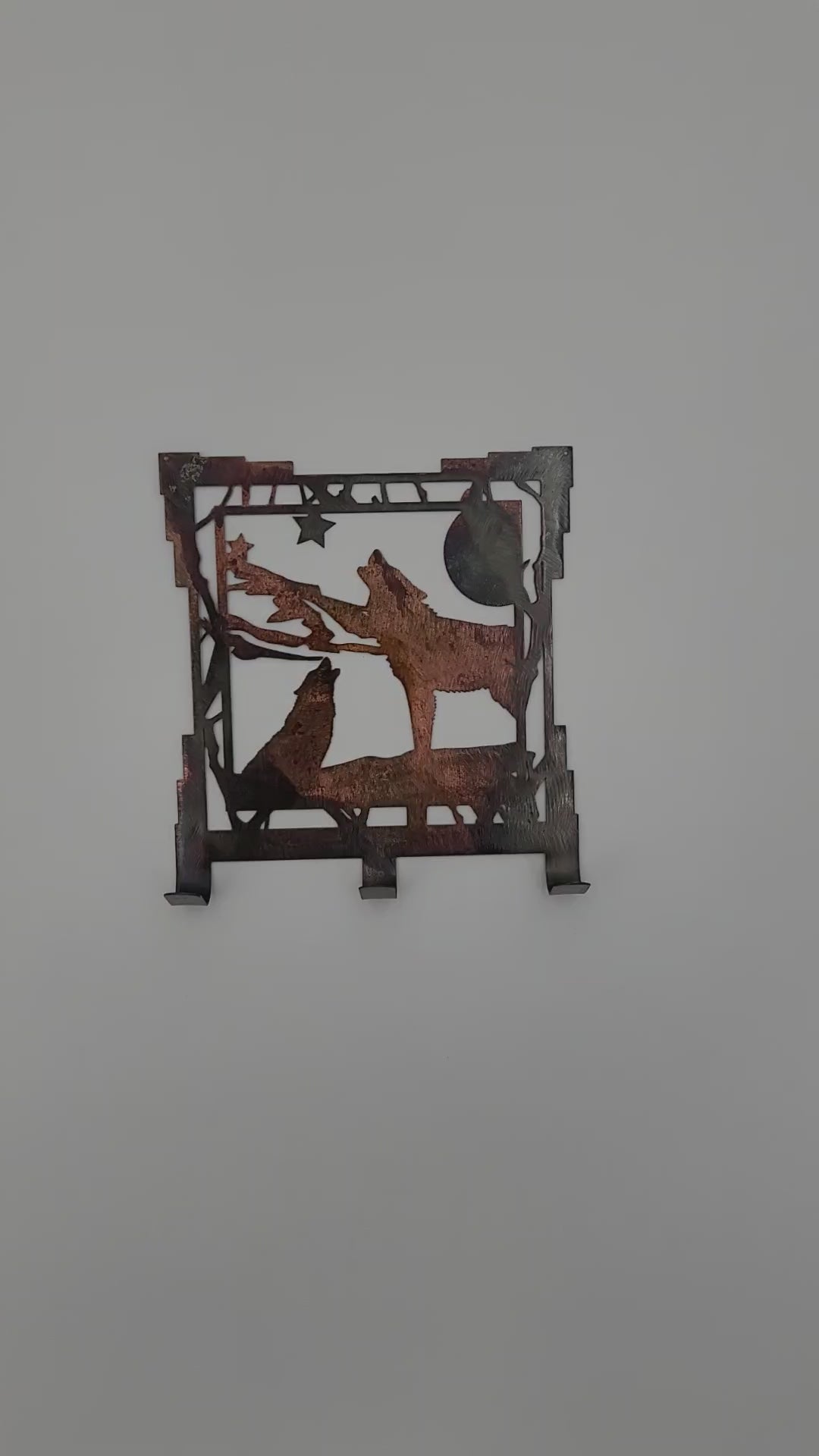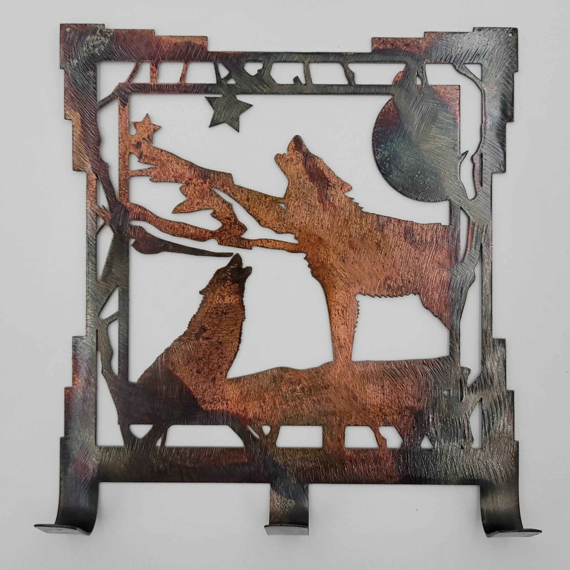 This Southwest Rustic Metal Wolf Key Rack is 6.25" wide x 7" high with an 18-gauge thickness. Three hooks allow for easy storage of keys, while two holes in the top corners enable easy hanging with two nails (not included). Available in five colors - Colored, Flat Black, Gloss Black, Hammer Tone, and Bare Metal. The colored version is hand ground to give it a textured appearance which may result in slight scratch marks on the finished product. Coloring may vary with the colored version due to the coloring process, but we do our best to replicate what you see in the photos. The black, hammer tone and bare metal versions will have a smooth finish. All are coated with a thick layer of Varathane.